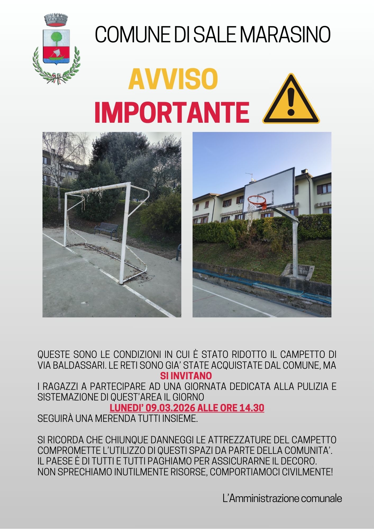 Descrizione Invito rivolto ai ragazzi di Sale Marasino a partecipare una giornata di pulizia e sistemazione del campetto di Via Baldassari - Lunedì 09.03.2026
