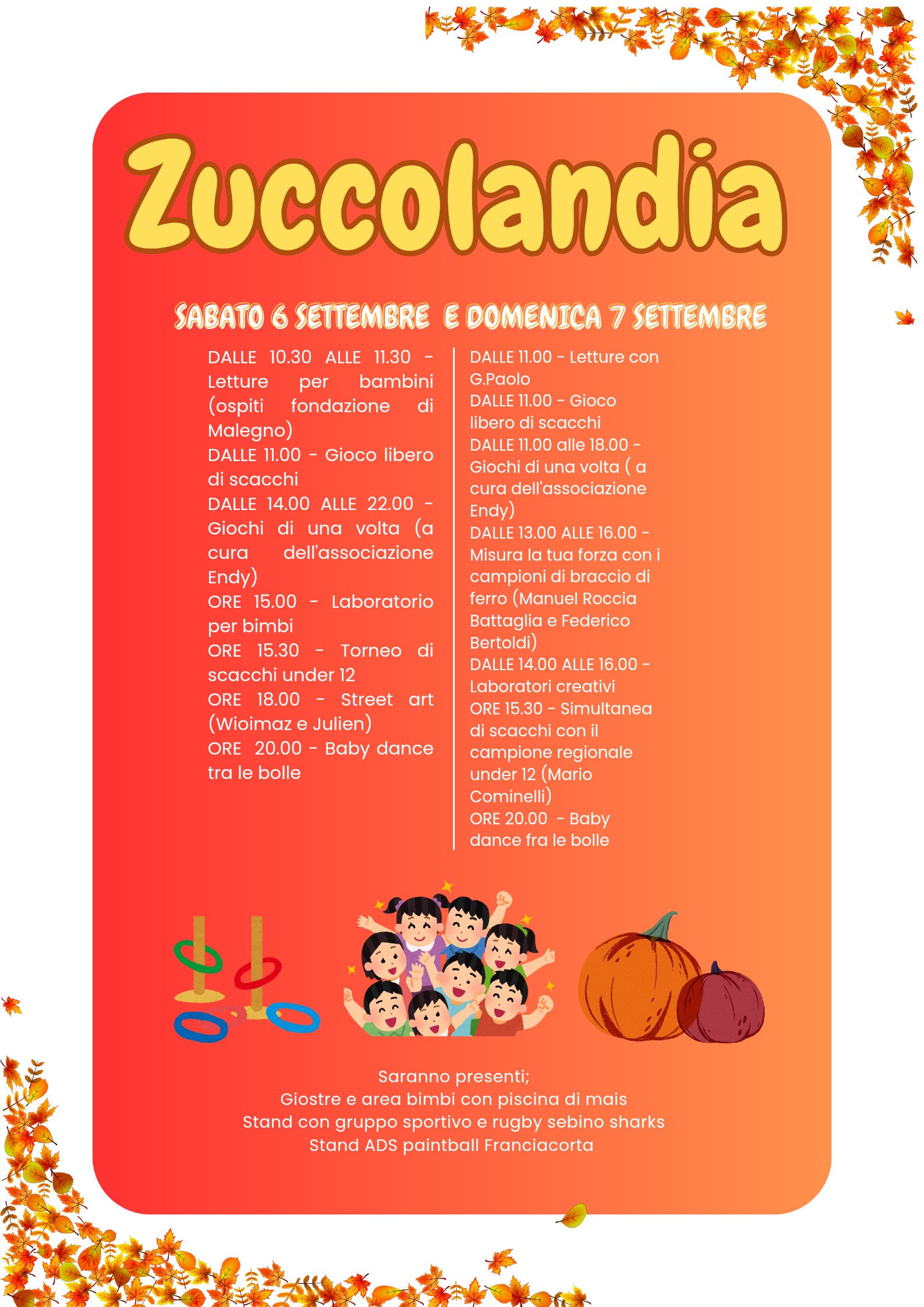 La giornata del sabato, oltre che dalla mostra mercato, sarà caratterizzata da attività di intrattenimento vario dedicate, sì agli adulti, ma con una particolare attenzione anche ai bambini. Si svolgeranno attività ludico-ricreative quali laboratori e spettacoli vari.